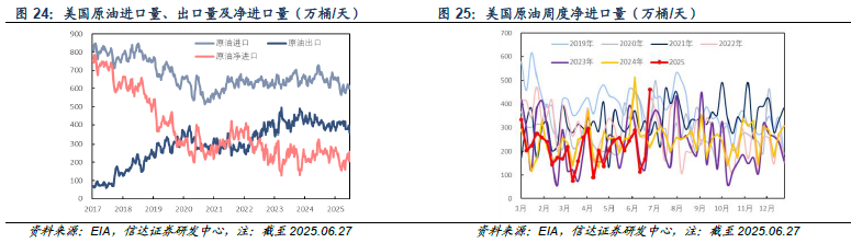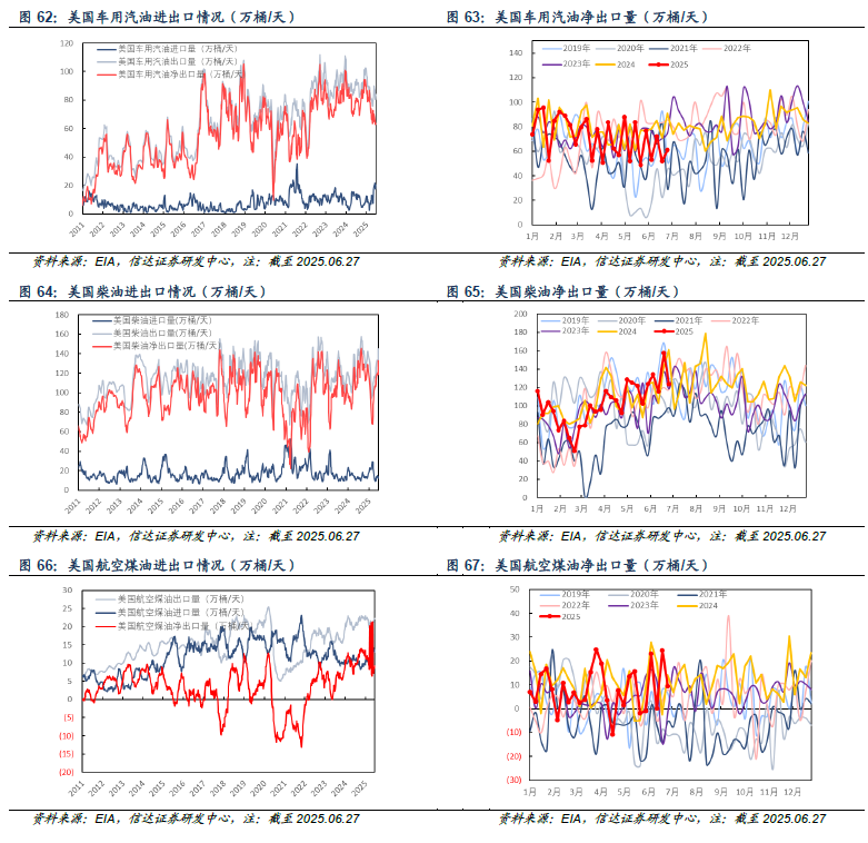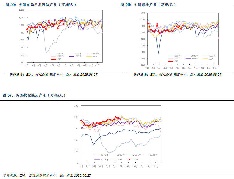 产量方面:截至2025年06月27日当周,美国成品车用汽油、柴油、航空煤油产量分别为962.1、503.4、191.8万桶/天,较上周分别-49.1(-4.86%)、+24.5(+5.12%)、-4.6(-2.34%)万桶/天。