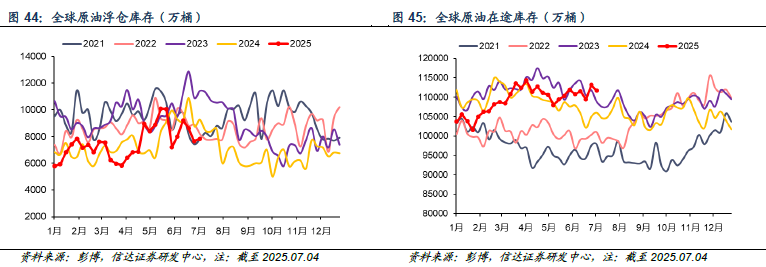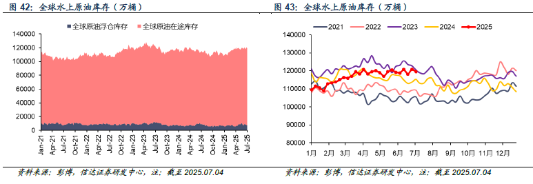 截至2025年7月4日当周,全球原油水上库存(包括在途和浮仓)为11.95亿桶,较上周-1320.4万桶(-1.10%)。其中,全球原油浮仓库存为7836.8万桶,较上周+179.6万桶(+2.29%);全球原油在途库存为11.17亿桶,较上周-1500万桶(-1.34%)。