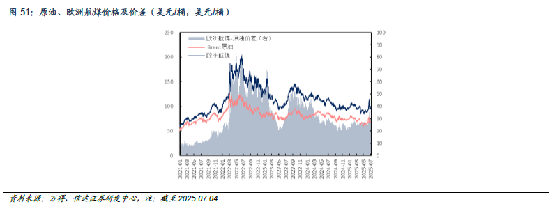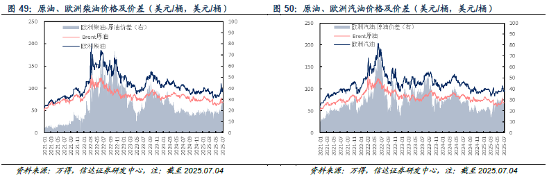 欧洲市场:截至2025年07月04日当周,欧洲柴油、汽油、航煤周均价分别为95.29(-1.65)、95.32(-4.62)、97.15(-3.60)美元/桶;与原油差价分别为27.27(-0.42)、27.30(-3.39)、29.13(-2.37)美元/桶。