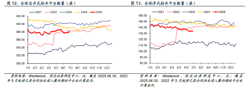 已有合同的钻井平台数量:截至2025年6月30日当周,全球海上自升式钻井平台数量为380座,较上周增加2座,其中非洲、东南亚、南美分别增加2、1、1座,中东减少2座;全球海上浮式钻井平台数量为134座,较上周持平,其中欧洲减少1座,其他地区增加1座。