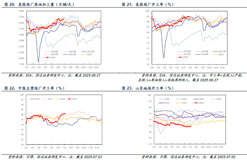 美国炼厂:截至2025年06月27日当周,美国炼厂原油加工量为1710.5万桶/天,较上周增加11.8万桶/天,美国炼厂开工率为94.90%,较上周上升0.2pct。