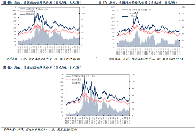 北美市场:截至2025年07月04日当周,美国柴油、汽油、航煤周均价分别为99.33(+1.90)、88.28(-1.21)、91.43(+1.79)美元/桶;与原油差价分别为31.30(+3.13)、20.26(+0.02)、23.41(+3.02)美元/桶。
