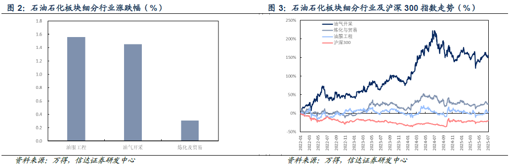 截至2025年7月4日当周,油服工程板块上涨1.56%,油气开采板块上涨1.45%,炼化与贸易板块上涨0.31%。