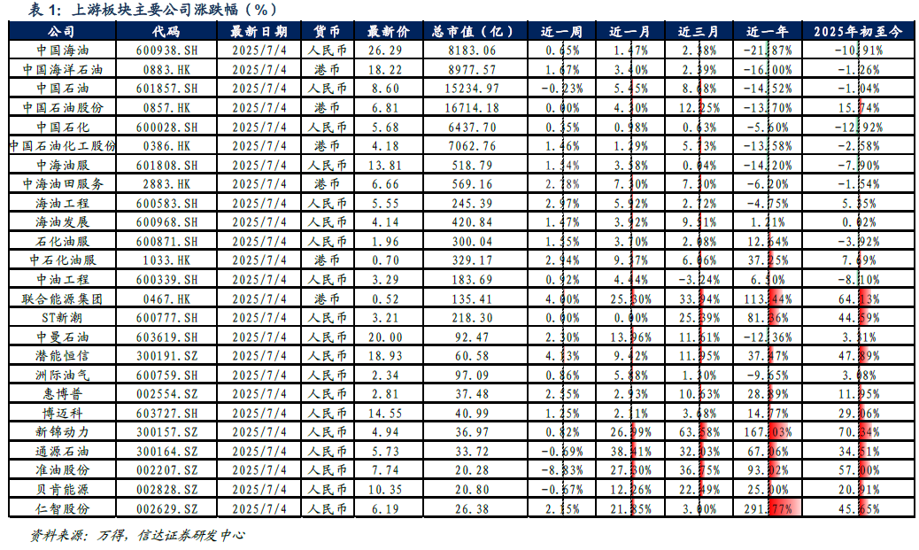 截至2025年7月4日当周,上游板块股价表现较好的潜能恒信(+4.13%)、联合能源集团H(+4.00%)、海油工程(+2.97%)。