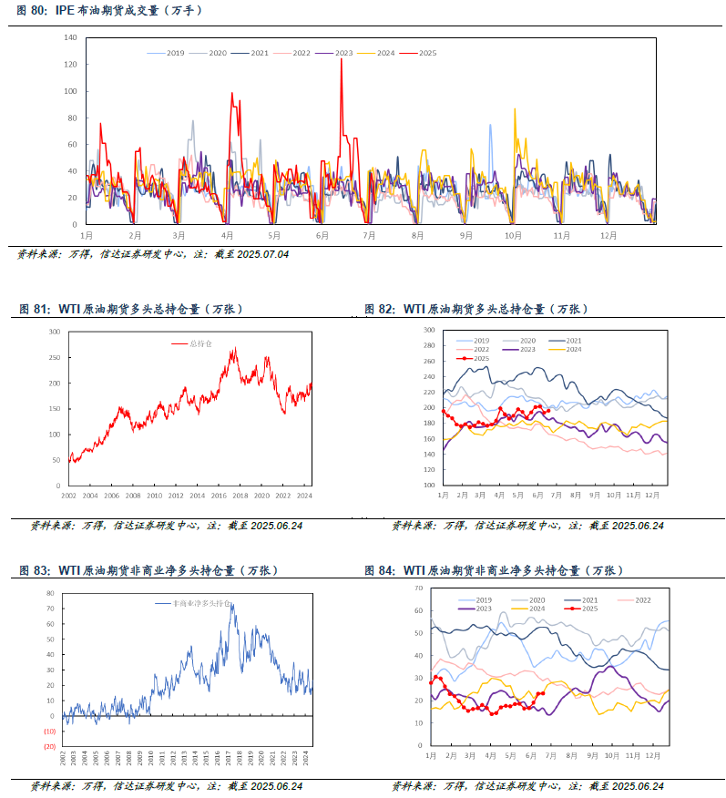 原油期货成交及持仓:截至2025年07月04日,周内布伦特原油期货成交量为118.02万手,较上周减少163.91万手(-58.14%)。截止至2025年06月24日,周内WTI原油期货多头总持仓量为196.2万张,较上周增加2.33万张(+1.20%);非商业(投机和套利目的持有)净多头持仓23.3万张,较上周增加0.19万张(+0.83%)。
